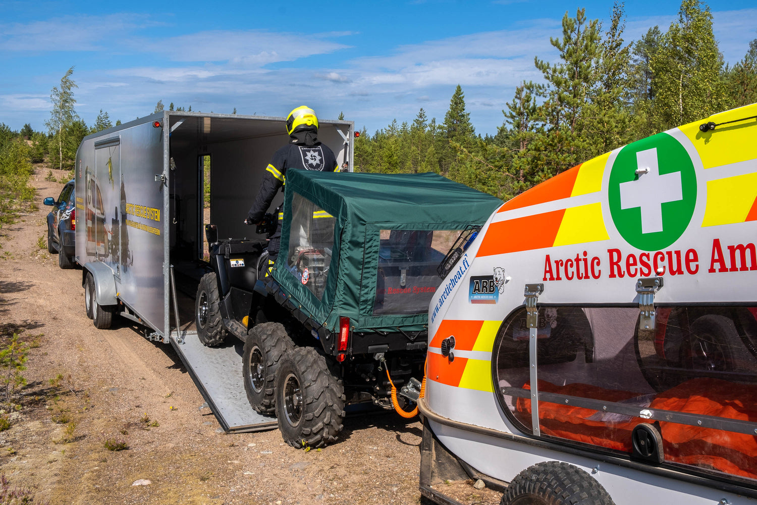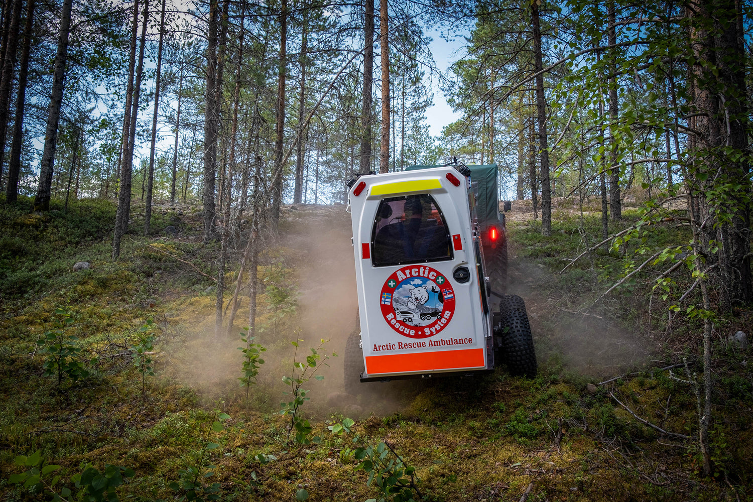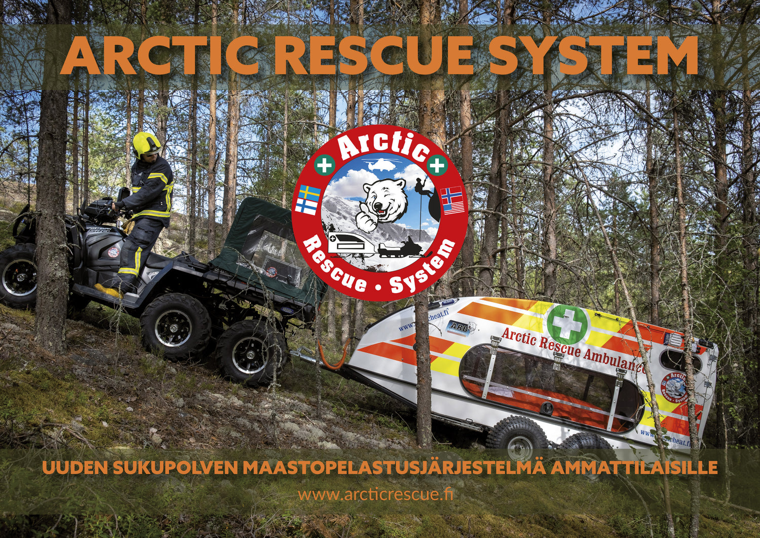 Kuljetusjärjestelmä ambulanssin nopeaan siirtämiseen tapahtumapaikalle. Maastoon lähtö vie vain 1 min. 10 sek. Arctic Rescue Trailer soveltuu monipotilassuojaksi lämmityksen ja ilmastoinnin ansiosta. Kärryyn on helppo perustaa myös tilannekeskus heti onnettomuuspaikalle saavuttaessa.